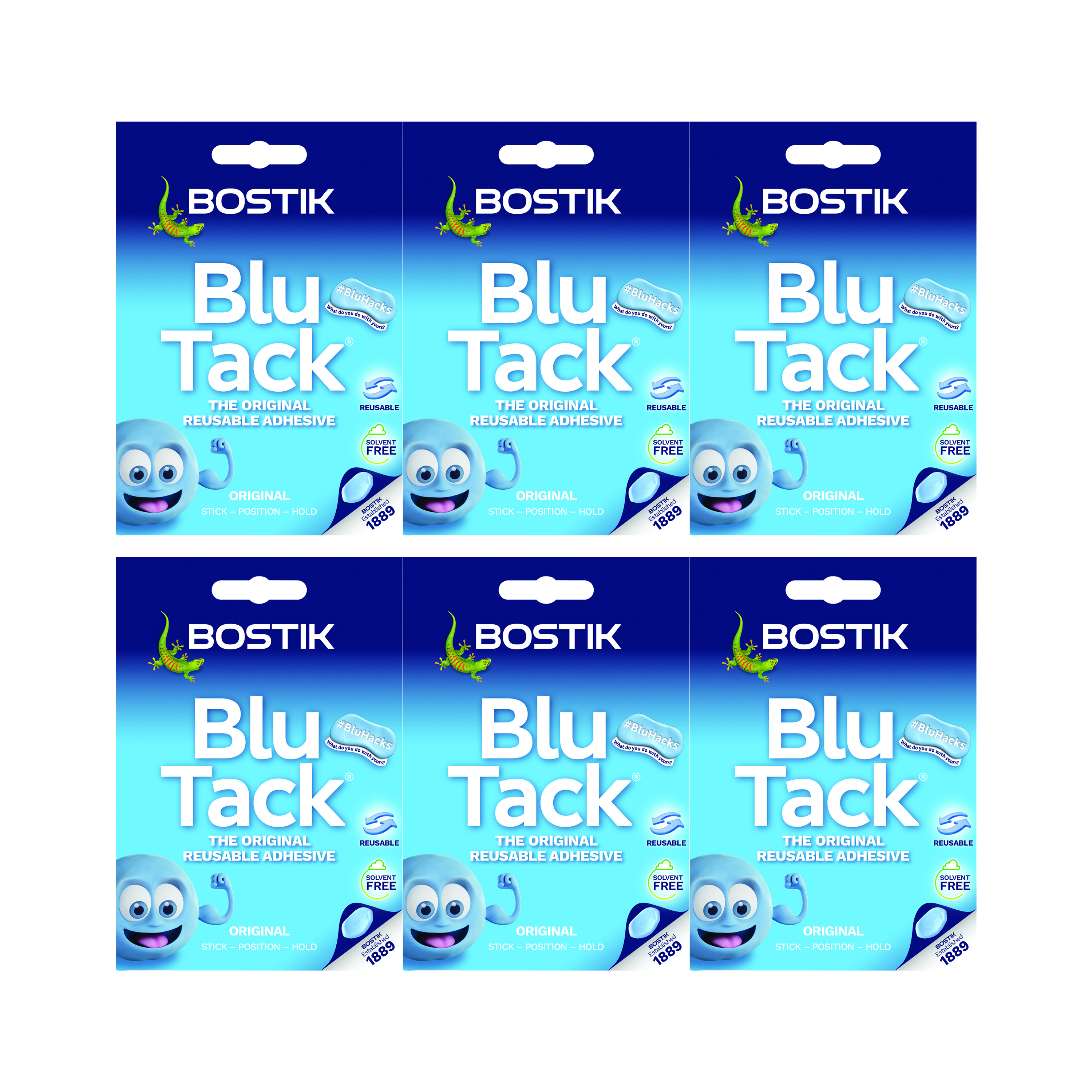Bostik Blu-tack Mastic Adhesive Non-toxic Handy Pack BlueProduct InformationThe original re-usable adhesive. Clean, safe and easy to use. Provides an ideal alternative to drawing pins and sticky tape. Holds up; posters, cards party decorations, maps, messages. Holds down : telephones and calculators to desks, ornaments etc.Features1000s of uses for home, office & school, Repositionable, reusable, versatile, clean and safe, The nation's favourite adhesive tack.Preparation and UsageHow to Use1. Pull off a piece of Blu Tack and activate it by pulling and stretching.2. Roll into a ball, place between the two surfaces and press firmly.Recommendations and suggestions are for guidance only, since conditions of use are completely beyond our control.Please read instructions carefully and retain this card for future reference.