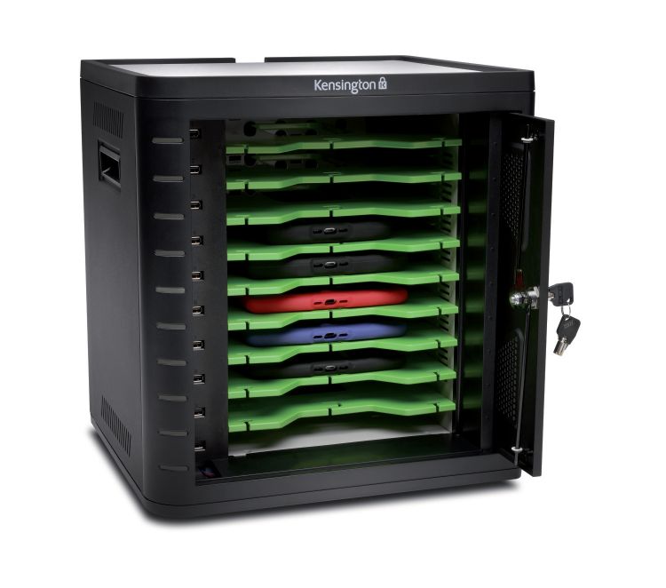 The cabinet has a Tamper-Resistant Door, complete with a genuine Kensington lock, and allows the front door to swing wide and retracts for easy access to cabinet interior. The integrated fan automatically switches on and dissipates heat as tablets start to warm up during the charging cycle, preventing overheating and damage. The cabinet can be locked down to a table or desk using either the mounting plate or Kensington cable lock.